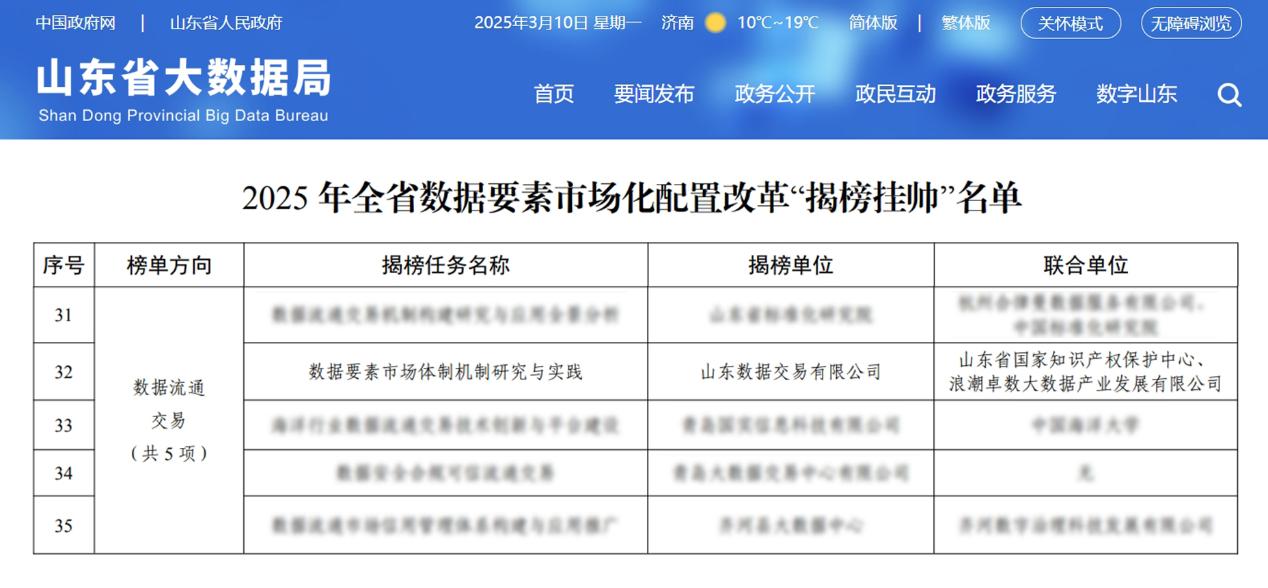 近日,山东省大数据局公布2025年全省数据要素市场化配置改革“揭榜挂帅”名单,由浪潮卓数大数据联合山东数据交易有限公司、山东省国家知识产权保护中心申报的“数据要素市场体制机制研究与实践”项目成功入选“数据流通交易”榜单。 ![]()