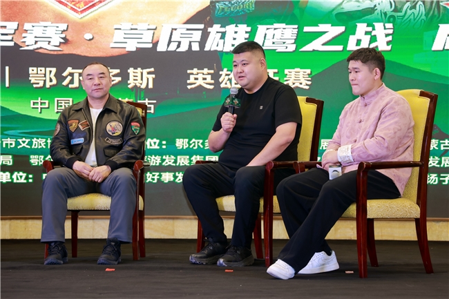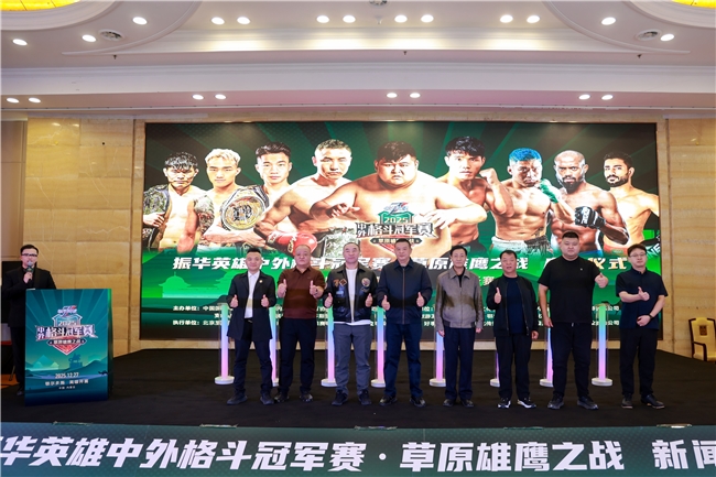 启动仪式环节,中国国际综合格斗联合会主席隗永华、内蒙格斗名将 敖日格乐、内蒙格斗名将、散打王宝力高、振华英雄创始人刘振华、鄂尔多斯市东胜区人民政府副区长乌云毕力格、鄂尔多斯市体旅文化发展有限公司代军、内蒙古恒翔达文化旅游有限公司董事长郝建军、内蒙古蒙泰集团有限公司党委书记、副总裁康维成共同触发启动装置,在全场热烈的倒计时声中,共同宣告“草原雄鹰之战”正式进入筹备快车道。随后,裁判员代表鲍辉庄严宣誓,确保了赛事的公平公正。一段展现蒙古族英雄气概的舞蹈《成吉思汗》,将现场氛围推向又一个高点。
